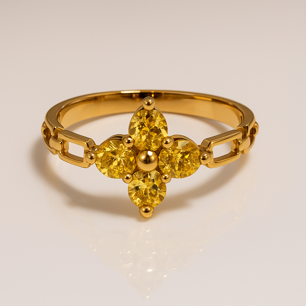 The Aurelia Gem Cross Ring captures the essence of sophistication with its exquisite four-stone clover design. Each gemstone—whether in Topaz Yellow or Royal Blue—is precision-set on a warm gold-plated band with interlocking geometric links, creating a stunning harmony of craftsmanship and color.